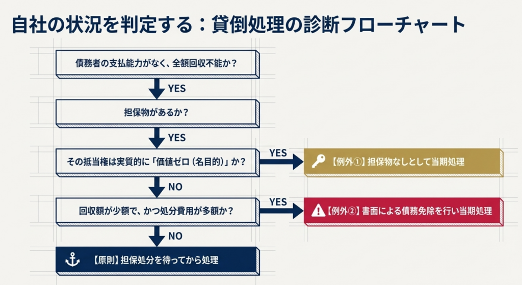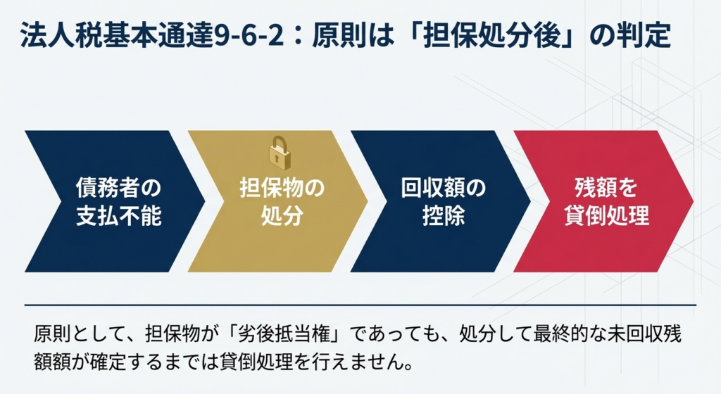 担保物の処分によって回収可能な金額が残っている場合には、原則としてその担保物を実際に処分した後でなければ貸倒処理を行うことはできません。