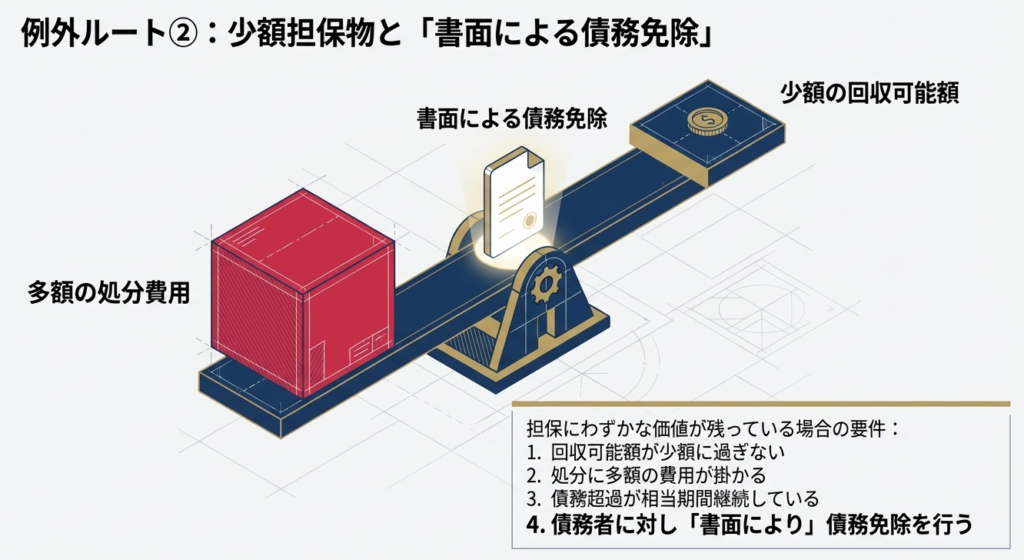 担保から回収できる可能性が「全くのゼロ」とは言い切れないが、極めて「少額」であり、かつその処分のために「多額の費用(競売費用等)」がかかることが見込まれる場合。