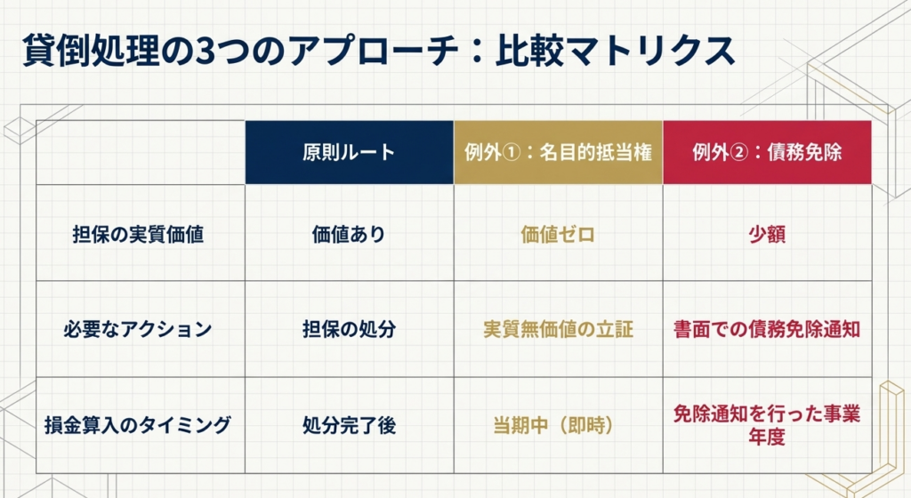 担保物の適正な評価額からみて、その抵当権が名目的なものであり、実質的に全く担保されていないことが明らかである場合に「ないもの」として取り扱うことができます。この判断により、処分を待たずに貸倒処理が可能となります。