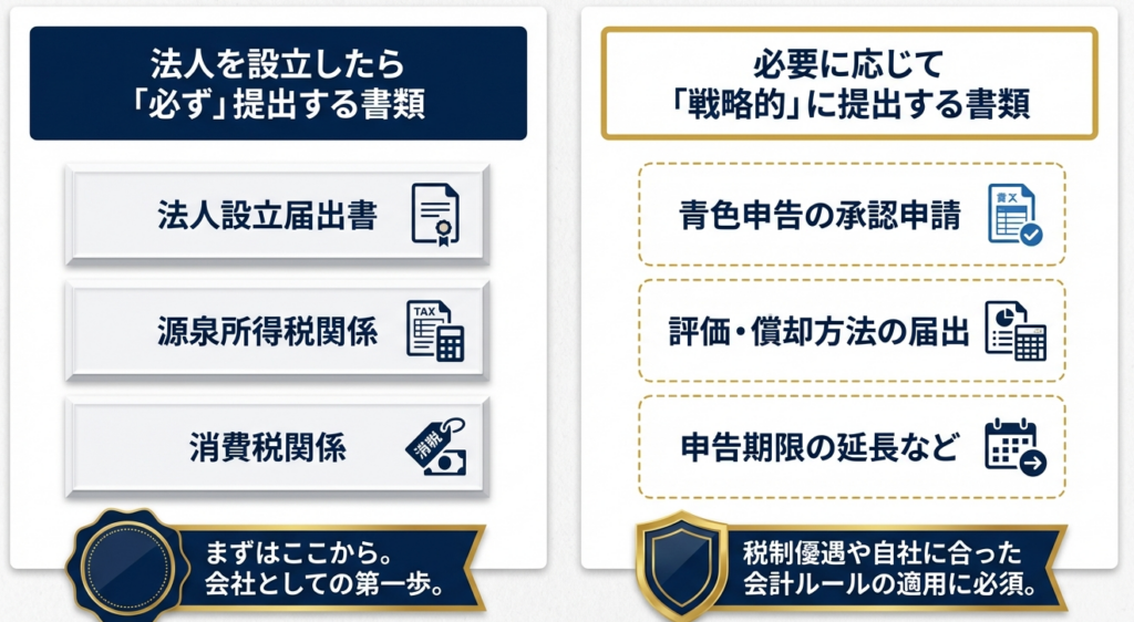国税庁の指針に基づき、各届出書類を「義務」と「戦略的任意」に分けて整理します。