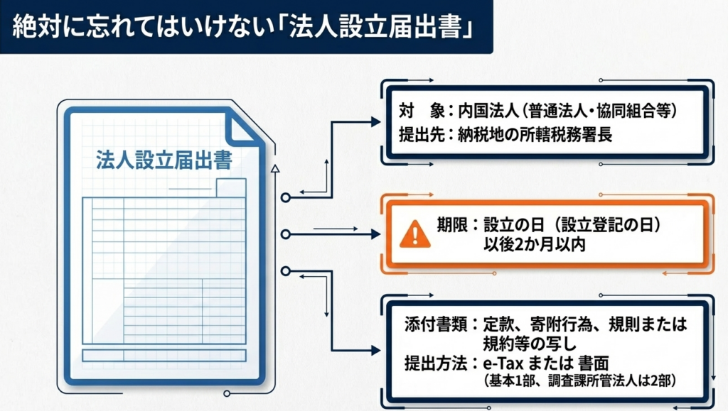 | 法人設立届出書 | 設立日から2か月以内 | 【リスク】 遅延すると法人口座開設に支障が出る。定款の写しを必ず添付。 |