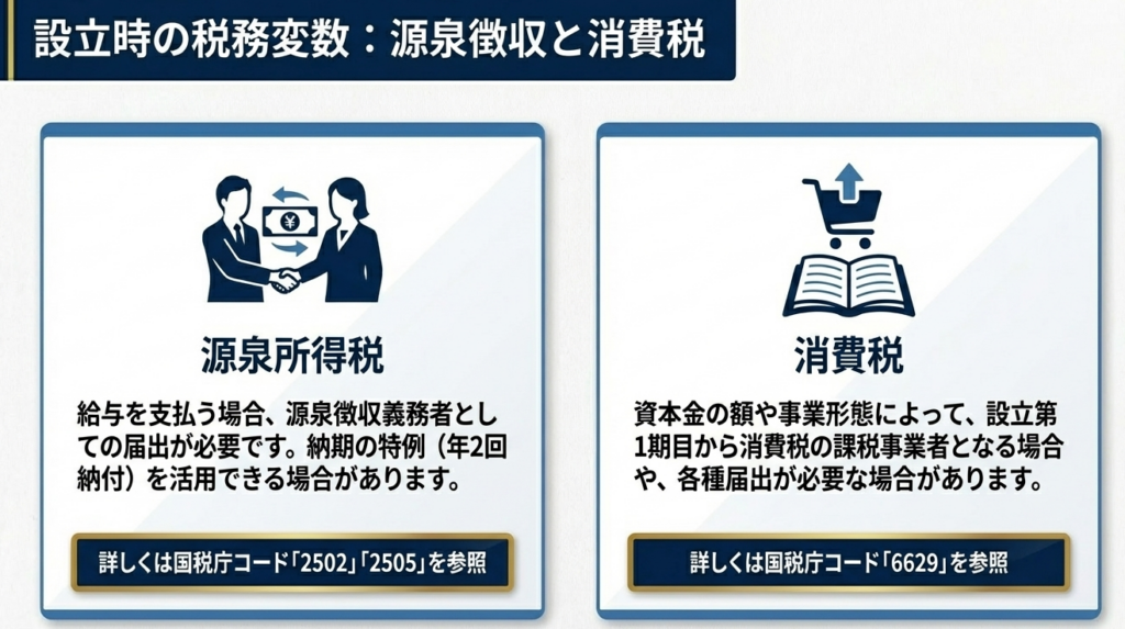 資料内では詳細な説明の代わりに、特定のコード番号(源泉所得税は2502・2505、消費税は6629)が参照先として示されています。これらは「法人設立届出書」とは別に確認し、必要に応じて提出する必要があります。