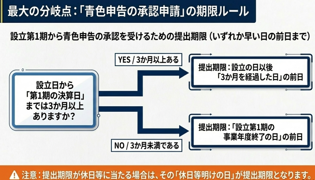 設立の日以後3か月を経過した日と、設立第1期の事業年度終了の日とのうち、いずれか早い日の前日までです。この期限が休日の場合は、休日明けの日が期限となります。