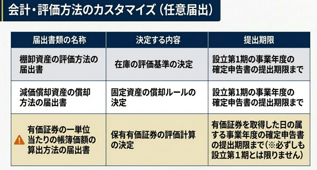 | 棚卸資産の評価方法の届出書 | 第1期の確定申告期限まで | 未提出時は「最終仕入原価法」。業種により利益調整リスクあり。 |