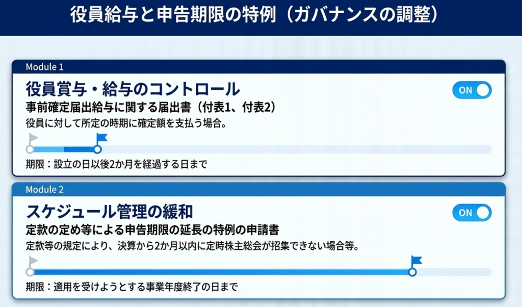 設立から3か月経過日または第1期末のいずれか早い方の前日まで。これを逃すと初年度の節税メリットをすべて失います。 - 事前確定届出給与に関する届出書(戦略的・任意):