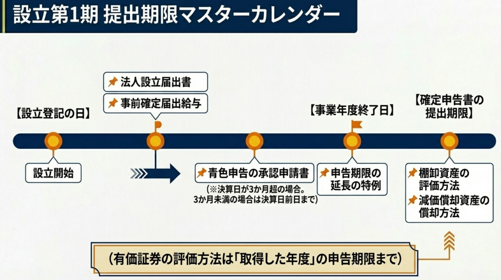 | 減価償却資産の償却方法の届出書 | 第1期の確定申告期限まで | 未提出時は「定率法(建物等は定額法)」。早期の経費化には確認必須。 |