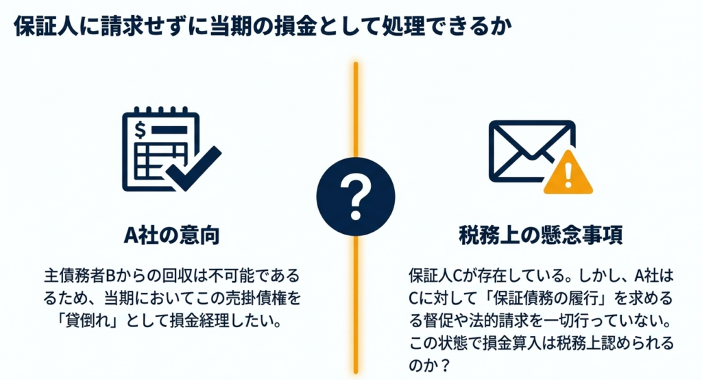 税務調査では、「主債務者が無資力であっても、保証人に請求すれば回収できたのではないか」「なぜ法的な回収手続きを尽くさずに損失処理したのか」という指摘が定石のように行われます。保証人の存在は、適正な損金算入を阻む大きな「壁」となり得るのです。