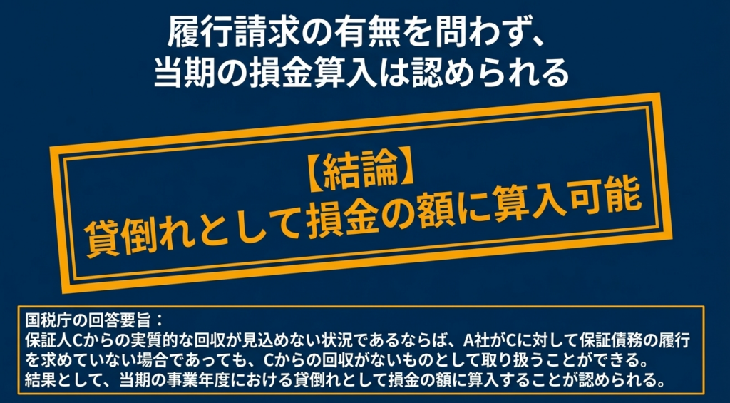 結論から申し上げますと、主債務者が無資力であり、かつ保証人についても履行能力がないことが客観的に明らかな場合には、たとえ保証人に対して具体的な履行請求(請求書の発行や訴訟提起など)を行っていない状態であっても、その債権の全額を貸倒損失として損金経理することが認められます。