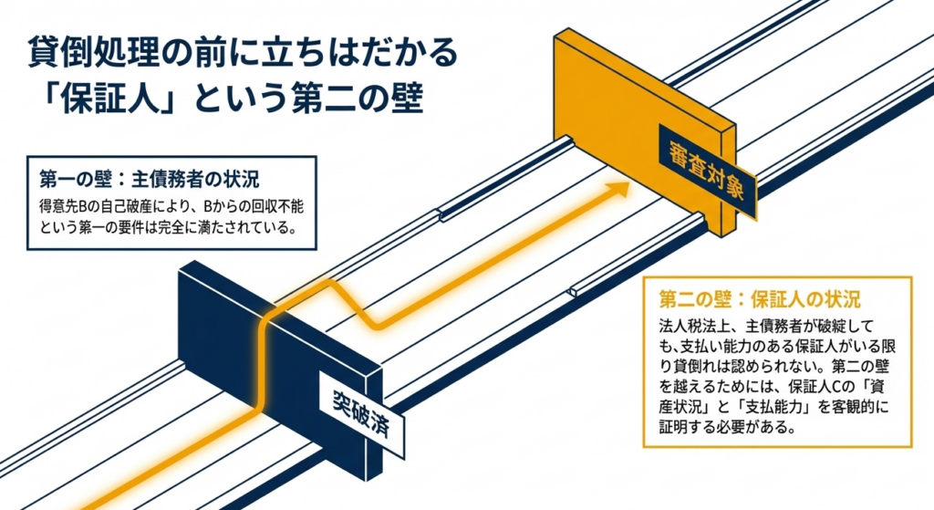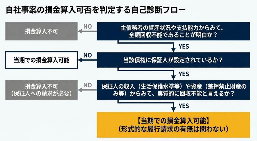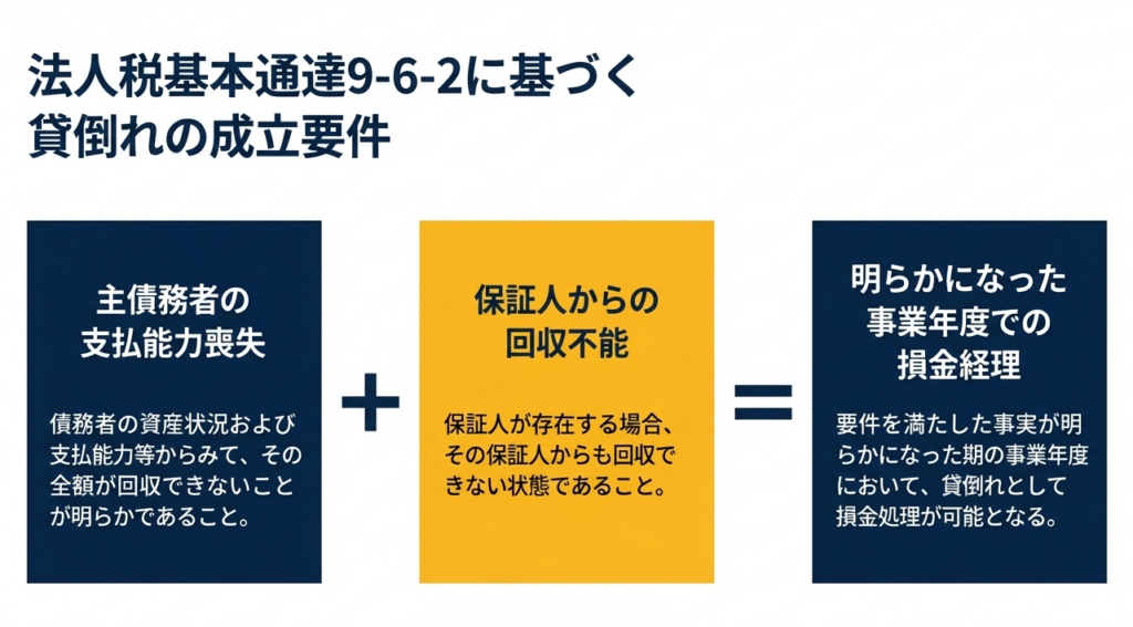 | 保証人がいる場合の特則 | 保証人があるときは、保証人からも回収できないときに貸倒処理が可能。 | 保証人は「第二の支払原資」です。主債務者の破綻=貸倒れではなく、保証人の資力まで調査が及んでいることが、損金算入の必須条件となります。 |