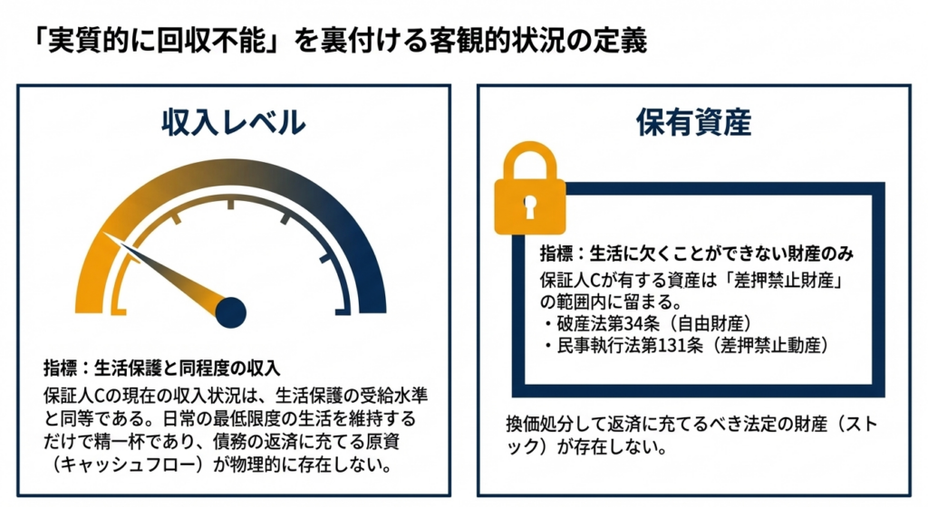 保証人Cが保有する資産が極めて少なく、法的にも差し押さえが不可能な範囲内であるため、そこからの回収が見込めないことを説明する根拠として用いられています。