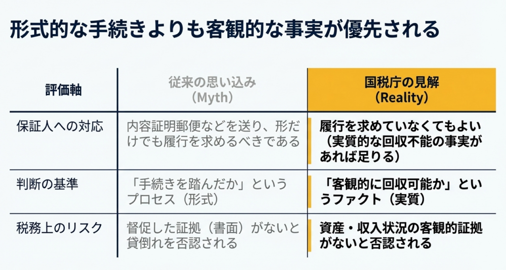 税務調査において、調査官は「なぜ保証人に請求しなかったのか」という一点を突いてきます。これに対し、「相手に金がないから」という主観的な説明だけでは不十分です。