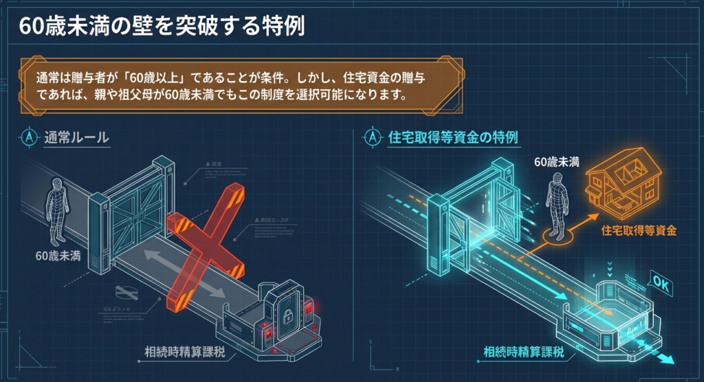 最大の戦略的価値は、「若年層への早期の資産移転」の促進にあります。通常の相続時精算課税制度には「贈与者が60歳以上」という年齢制限がありますが、住宅取得資金(土地等の取得費も含む)に限り、この制限が撤廃されます。