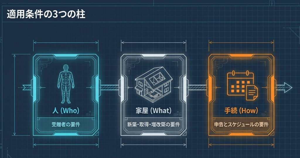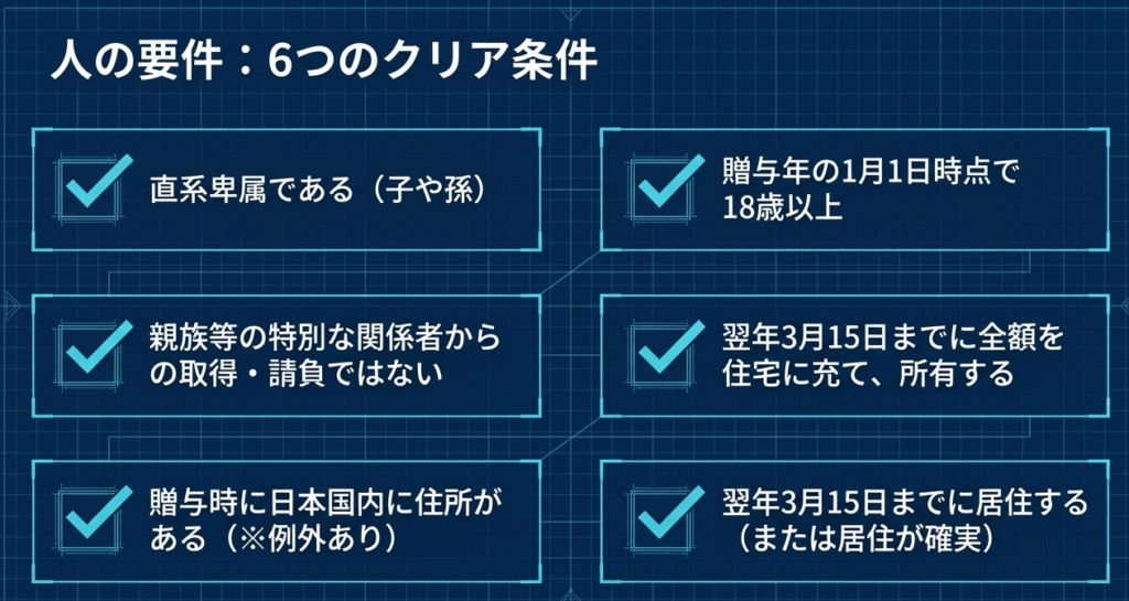 特例の適用には、受贈者、住宅、贈与者の三者それぞれに厳格な要件が課されています。