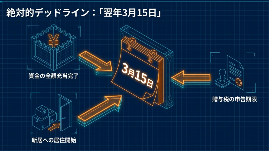 贈与を受けた年の翌年3月15日までに、取得した住宅取得等資金の全額を住宅の新築等に充てなければなりません。この期限を遵守することが特例適用の必須条件の一つです。