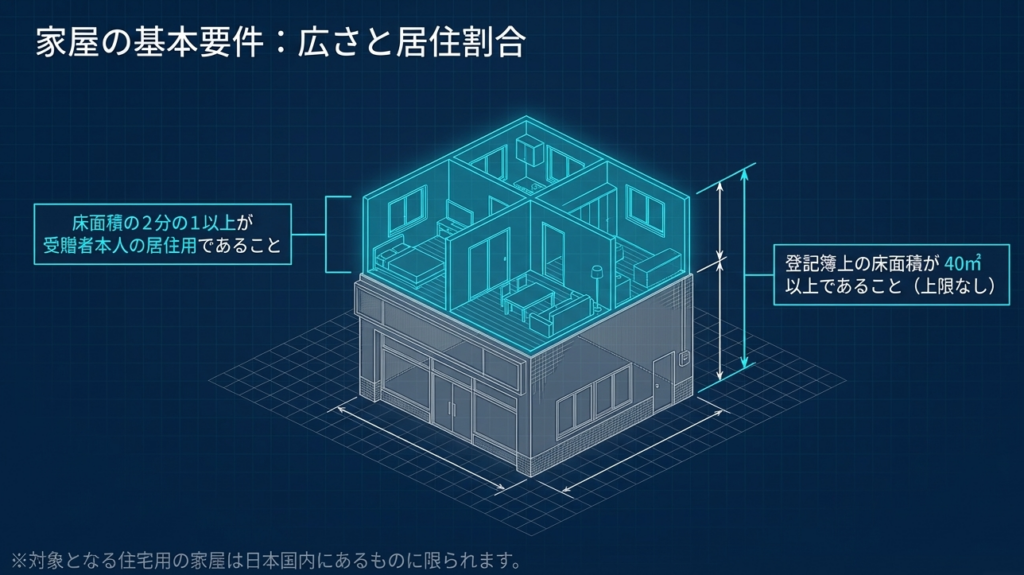 住宅用の家屋の登記簿上の床面積が40平方メートル以上であることが必要です。また、その家屋の床面積の2分の1以上に相当する部分が、受贈者自身の居住の用に供されるものでなければなりません。
