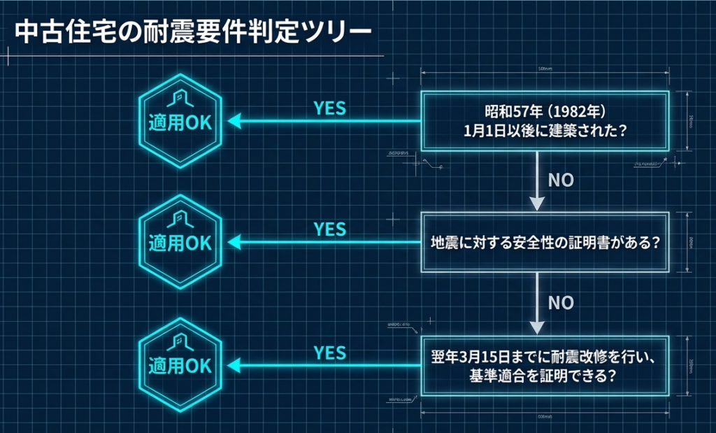 原則として昭和57年1月1日以後に建築されたものである必要があります。これに該当しない場合でも、地震に対する安全性に係る基準に適合することが証明されているものや、取得後に耐震改修を行う一定の住宅であれば対象となります。