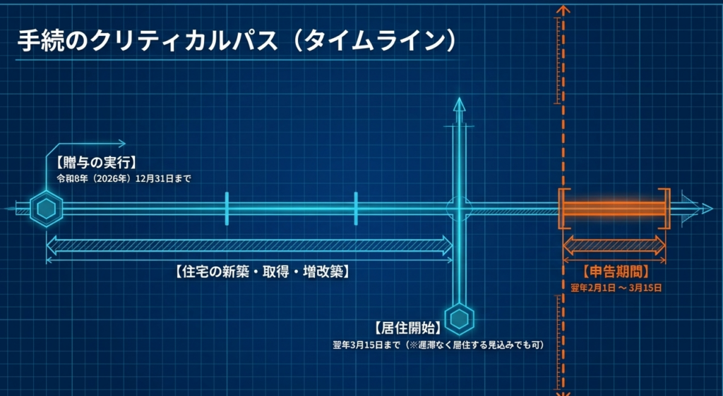 この特例は、令和8年(2026年)12月31日までに贈与を受けた場合に適用されます。この期限までに、自己の居住の用に供する住宅の新築、取得、または増改築等の対価に充てるための資金を取得する必要があります。