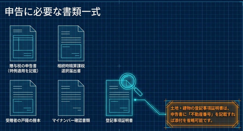 主な添付書類は、贈与税の申告書、相続時精算課税選択届出書、および受贈者の戸籍の謄本です。なお、土地・建物の登記事項証明書については不動産番号を記載することで添付を省略することも可能です。