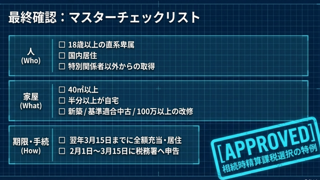 本特例は「今、納税するか、後で相続税として精算するか」の選択です。精算メカニズムを正しく伝えた上で、適用を判断するための厳格な要件を見ていきましょう。