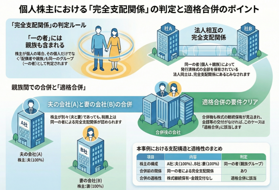 夫と妻は「一の者」として扱われるため、A社とB社の間には「同一の者による完全支配関係」が認められます。 - 適格合併の該当性: