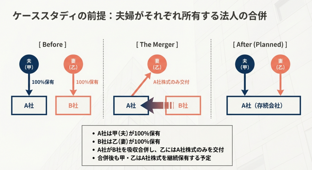 夫が100%出資するA社が、妻が100%出資するB社を吸収合併するケースについての解説です。この場合、両社間に「同一の者による完全支配関係」があるか、そして「適格合併」となるかがポイントとなります。