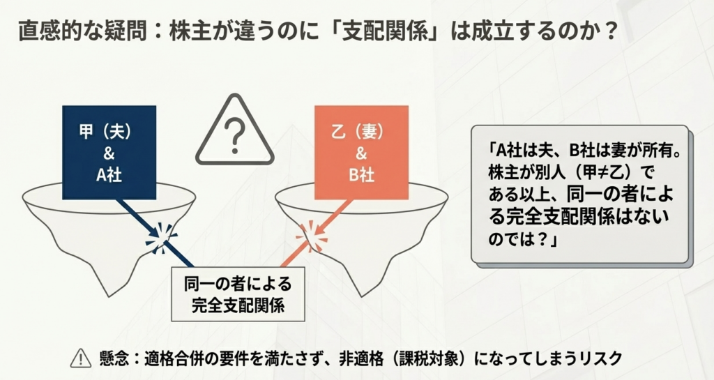 A社の全株式は甲が、B社の全株式は乙がそれぞれ単独で保有しているため、形式上は株主が異なる(別の者である)ように見えることから、同一の者による支配がないのではないかという疑義が生じます。