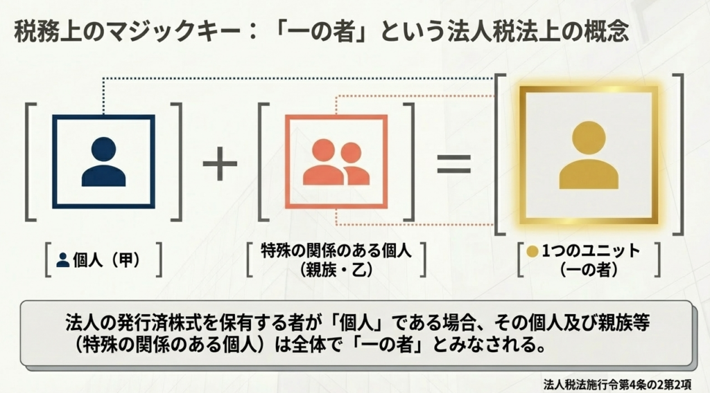 この適格判定の鍵を握るのが「完全支配関係」の有無ですが、実務担当者が特に注目すべきは「一の者」という概念の解釈です。税務上、この「一の者」は単独の個人を指すにとどまりません。親族等の「特殊の関係のある個人」を含めて一体として判定するというルールがあります。