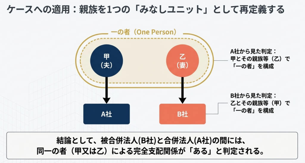 乙から見ても同様です。夫(甲)は親族であり、乙と甲は「一の者」です。この「一の者」がA社とB社の両方を支配していると判定されます。 - 結論: