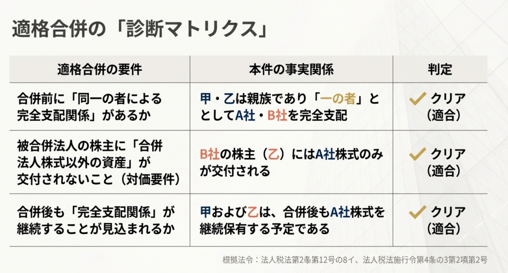 甲と乙は親族であり「一の者」とみなされるため、A社とB社は同一の者による完全支配関係にあると判定されます。また、対価が株式のみであり、合併後の継続保有も見込まれるため、適格合併に該当します。