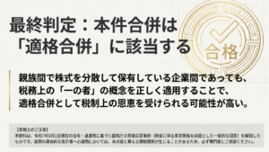 日本のオーナー企業においては、株式が親族間で分散して保有されているケースが多々あります。本件のルールを正しく理解することは、同族グループ内での柔軟な再編を可能にするための「実務上の必須知識」と言えるでしょう。