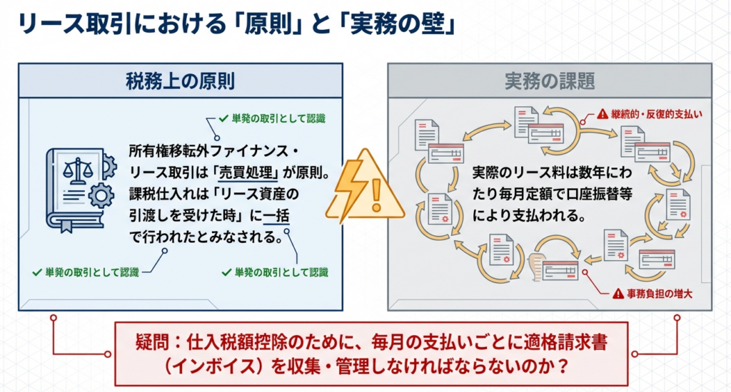 インボイス制度(適格請求書等保存方式)の施行は、単なる事務負担の増加ではなく、企業のガバナンスとDX(デジタルトランスフォーメーション)の成熟度を問う試金石となっています。特にリース取引においては、契約が数年に及ぶため、毎月の請求書を都度回収・管理する旧来の手法は、事務効率の著しい低下を招きます。