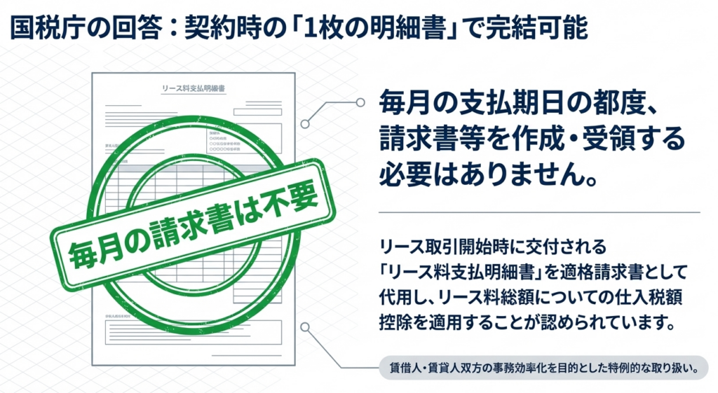 賃借人および賃貸人の事務効率化を目的としています。リース料は支払回数や金額が契約で確定しており、振込や口座振替で支払われることが多いため、都度の請求書作成を省略する運用がなされています。