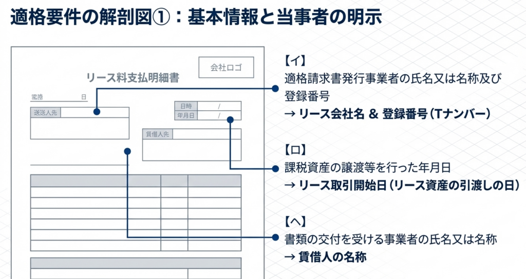 リース料支払明細書が、単なる支払予定表ではなく、法的な「証憑(エビデンス)」として機能するためには、消費税法第57条の4第1項に規定される記載事項をすべて満たしている必要があります。
