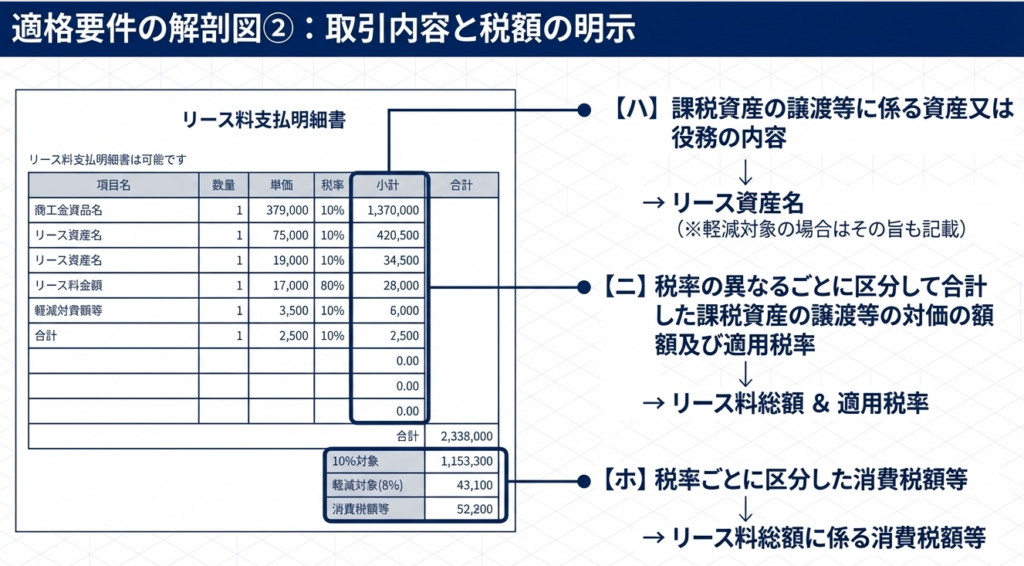| ニ 税率別に区分した対価の額及び適用税率 | リース料総額(全期間分)、および適用される税率(10%等) |