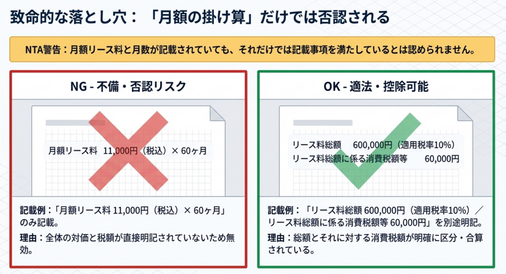 ここで最も注意すべき、かつ現場で最も頻出するミスは、「リース料総額」の記載漏れです。 多くのリース会社が発行する明細書には、「月額リース料」と「支払回数」は記載されていますが、インボイスの要件はあくまで「取引(売買)の総額」を求めるものです。「月額 × 回数」の計算を読者に委ねる形式は、法的にはインボイスとして認められません。