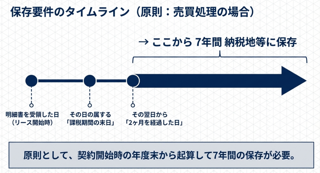 会計上で賃貸借処理(費用計上)を選択している場合であっても、消費税法上の保存義務は残ります。この場合、リース料の「最終支払期日」の属する課税期間の末日の翌日から2月を経過した日から「7年間」保存が必要です。