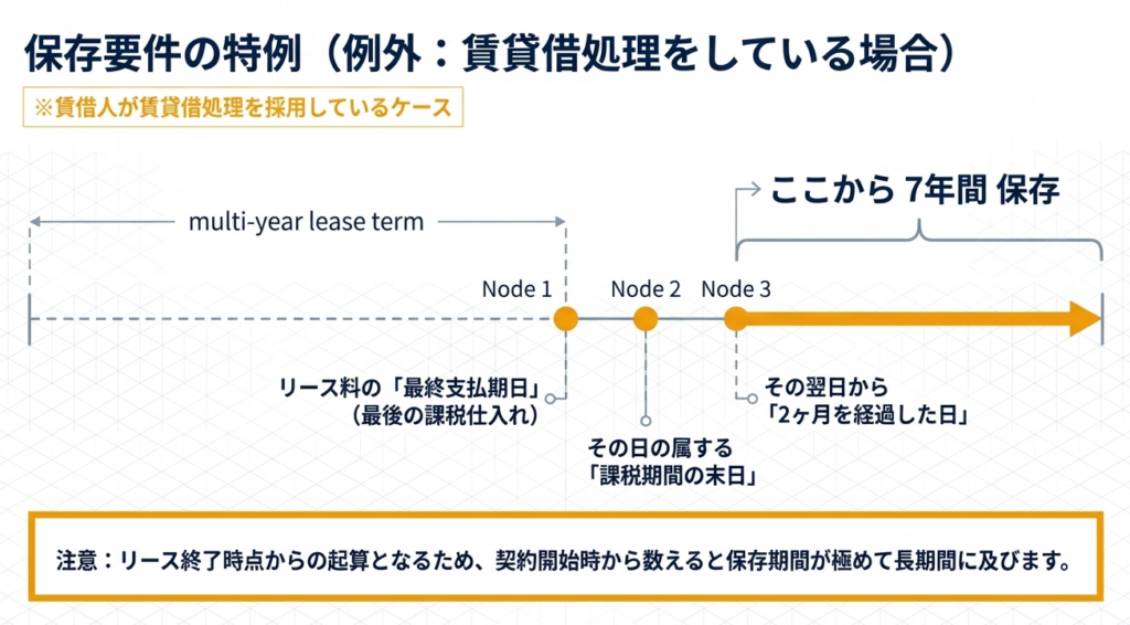 賃貸借処理(例外的な会計処理)をしている場合は、リース料の最終支払期日の属する課税期間の末日の翌日から2月を経過した日から7年間保存する必要があります。これは最後の課税仕入れを基準とするためです。