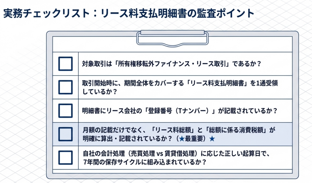 現在契約中のリース物件について、明細書に「リース料総額」と「消費税総額」が記載されているか再確認する。不足があれば即座に再発行を依頼する。 - 電子帳簿保存法への対応: