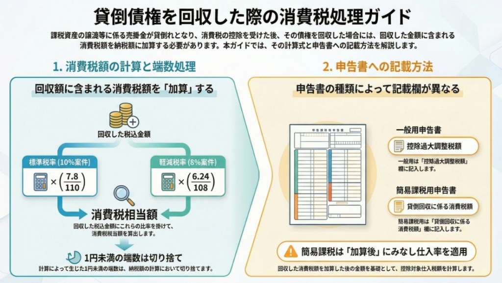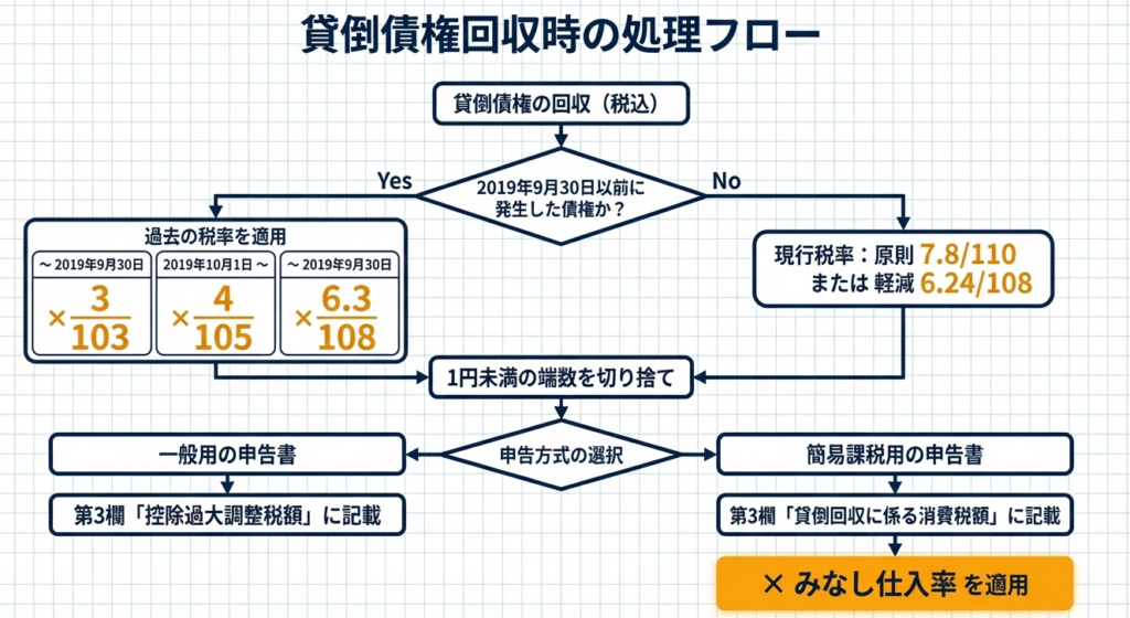 我々実務家が最も注意を払うのは、個々の債権ごとに計算して合算するのではなく、「課税期間中に回収した金額の合計額」に対して計算を行うという点です。これにより、端数処理の累積による誤差を防ぐことができます。