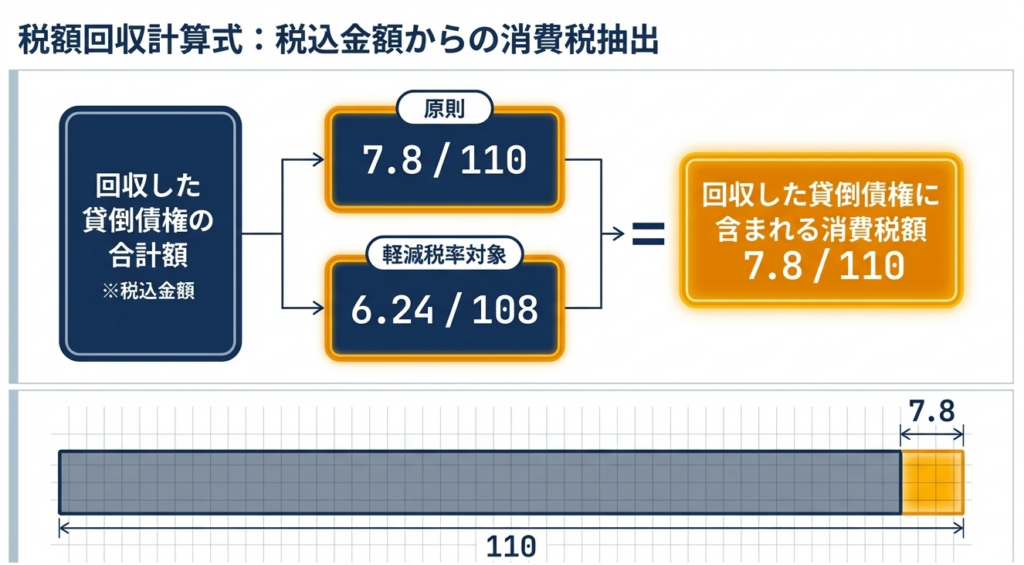 原則として、回収した貸倒債権の合計額に「110分の7.8」を掛けて計算します。