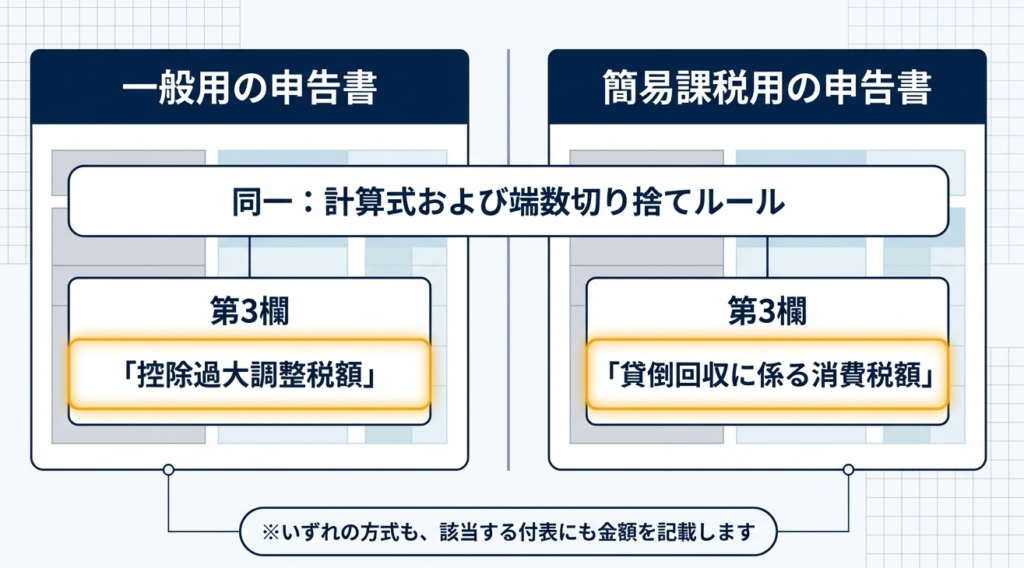 申告書への記載方法については、一般用の申告書の場合は第3欄の「控除過大調整税額」に記載し、簡易課税用の申告書の場合は第3欄の「貸倒回収に係る消費税額」に記載して申告を行います。