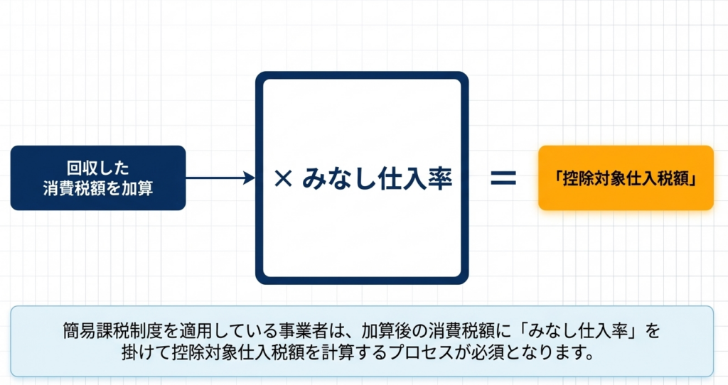 簡易課税制度では、「課税標準額に対する消費税額」に「回収した貸倒債権に係る消費税額」を加算した後の金額に対して、業種に応じた「みなし仕入率」を乗じて控除対象仕入税額を算出します。