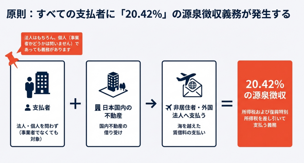 非居住者や外国法人(非居住者等)に対して、日本国内にある不動産の賃借料を支払う場合、支払者は法人・個人(事業を営んでいるか否か)を問わず、支払時に20.42%の税率で所得税および復興特別所得税を源泉徴収する義務があります。