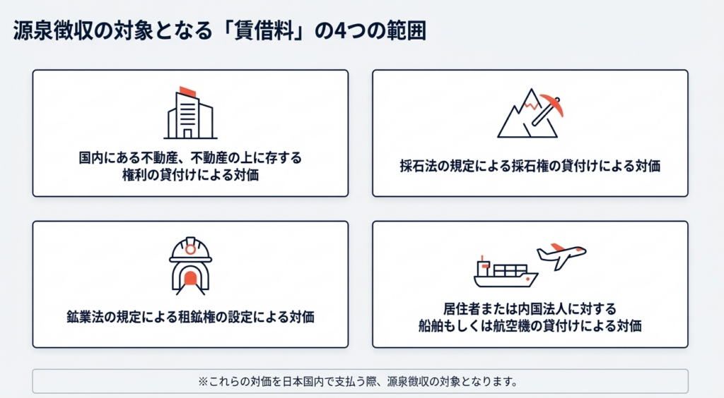 国内にある不動産やその上の権利の貸付けに加え、採石権や租鉱権の貸付け、さらに居住者や内国法人に対する船舶・航空機の貸付けによる対価も含まれます。