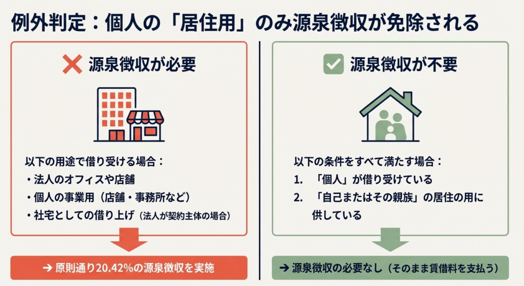 原則として厳しい源泉徴収義務が課されますが、事務負担の軽減や居住安定への配慮から、以下の条件を「すべて」満たす場合に限り、源泉徴収は不要とされています。