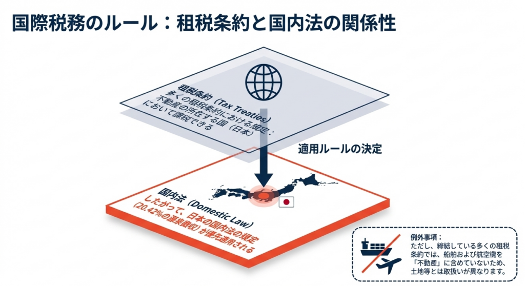 我が国が締結している多くの租税条約では、「不動産が所在する国(日本)」に優先的な課税権を認めています。そのため、国内法の規定が優先され、日本での源泉徴収が必要となるのが一般的です。
