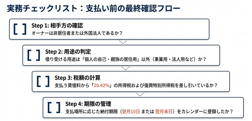 後日の税務調査で「居住用だと思っていた」という言い訳は通用しません。免除規定を適用する場合は、必ず賃貸借契約書の写しを確認し、「専ら居住用であること」を明記した確認書などを徴収しておくべきです。この「負担の立証責任」は常に支払側にあります。