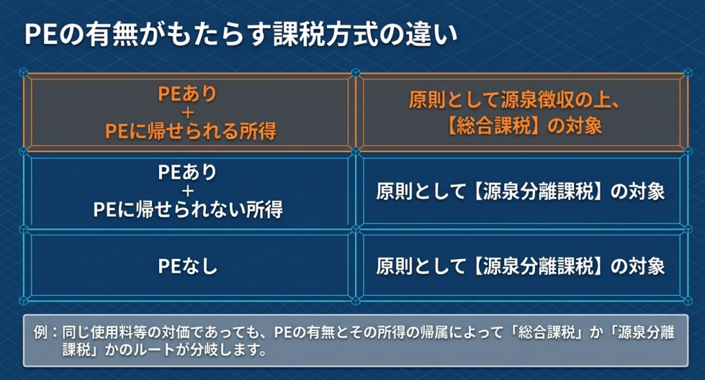 PEの有無は、日本の課税権が及ぶ「国内源泉所得」の範囲を確定させ、その課税方式を決定付ける極めて重要な分岐点だからです。