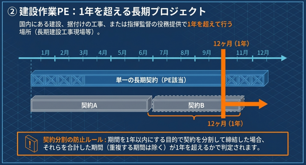 国内にある建設、据付けの工事、またはこれらの指揮監督の役務の提供で、その期間が1年を超える場所が該当します。これらは「長期建設工事現場等」と呼ばれ、恒久的施設の第2区分に分類されます。