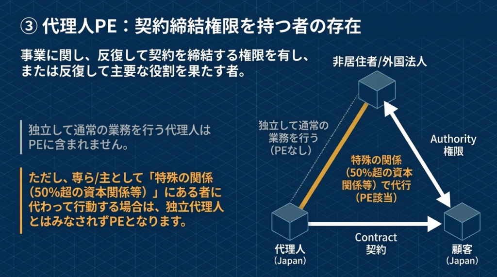 | 契約締結代理人等 | 非居住者等のために国内で反復して契約を締結、または締結のために主要な役割を果たす代理人。 |